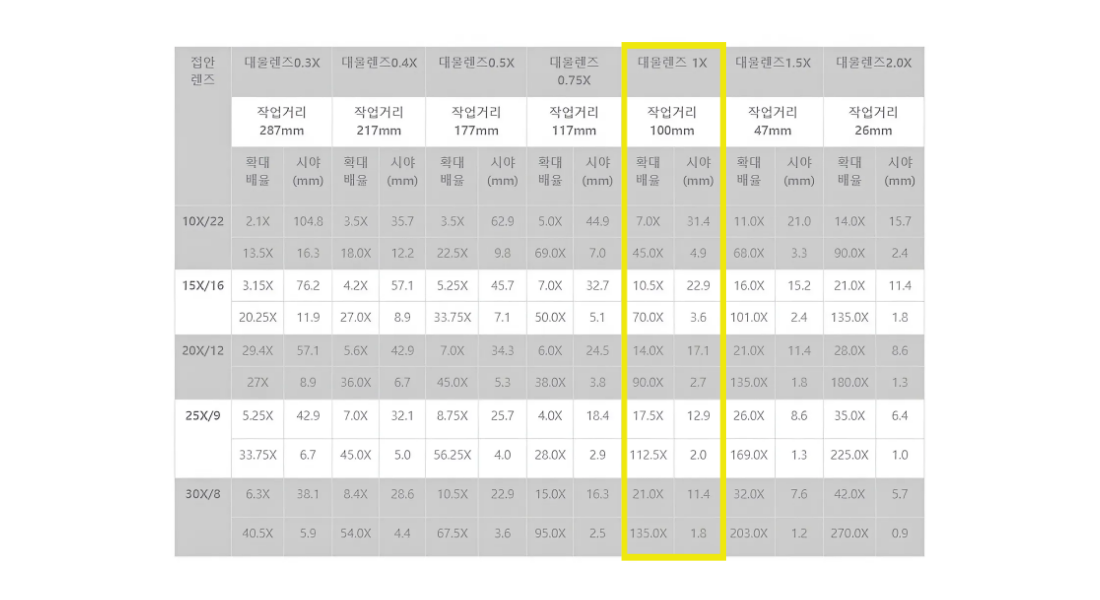 보조대물렌즈 선택시 총배율 확대, 축소 관찰이 가능합니다.