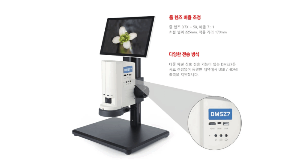 줌방식으로 배율은 0.7X ~ 5X 까지 가능합니다.(기본배율)